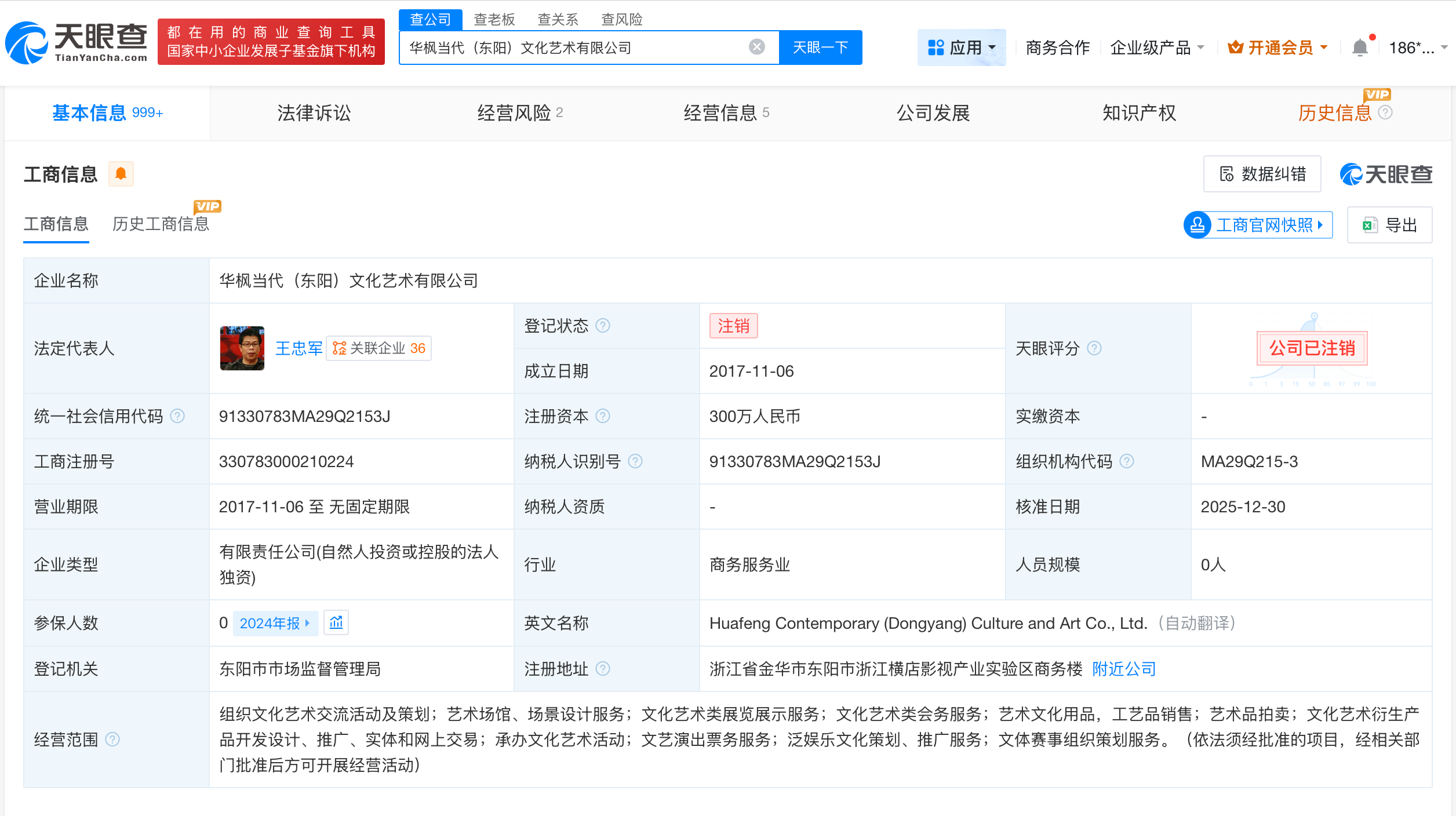 天眼查工商信息显示,近日,华枫当代(东阳)文化艺术有限公司登记状态由存续变更为注销。