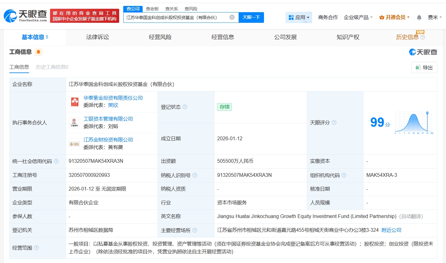 天眼查工商信息显示,近日,江苏华泰国金科创成长股权投资基金(有限合伙)成立,执行事务合伙人为华泰紫金投资有限责任公司、工银资本管理有限公司、江苏金财投资有限公司,出资额50.55亿人民币,经营范围为以私募基金从事股权投资、投资管理、资产管理等活动,股权投资,创业投资。合伙人信息显示,该基金由工银资本管理有限公司、江苏金财投资有限公司、江苏社保科创股权投资基金(苏州)合伙企业(有限合伙)、南京道信投资管理中心(普通合伙)、华泰证券(601688)旗下华泰紫金投资有限责任公司共同出资。