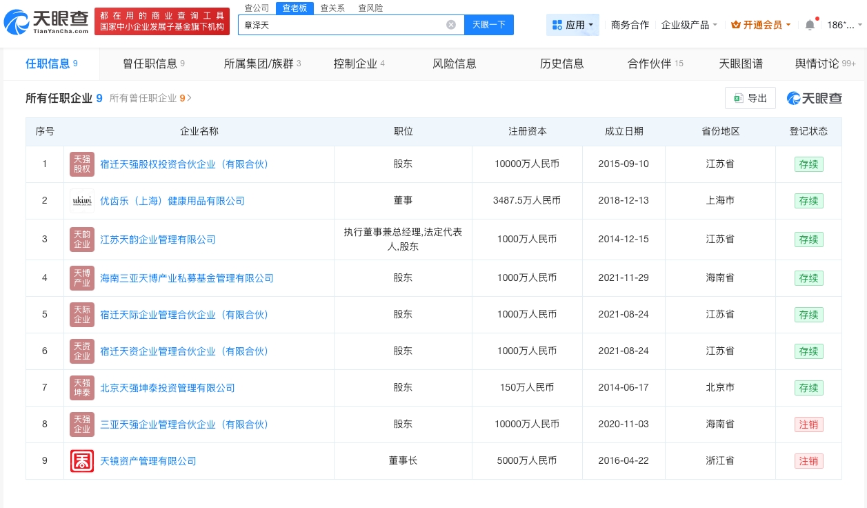 天眼查app显示,章泽天名下关联9家企业,其中7家为存续状态,包括江苏天韵企业管理有限公司、宿迁天强股权投资合伙企业(有限合伙)等,涉及企业管理、投资管理等领域,章泽天在上述企业担任执行董事兼总经理等职务。