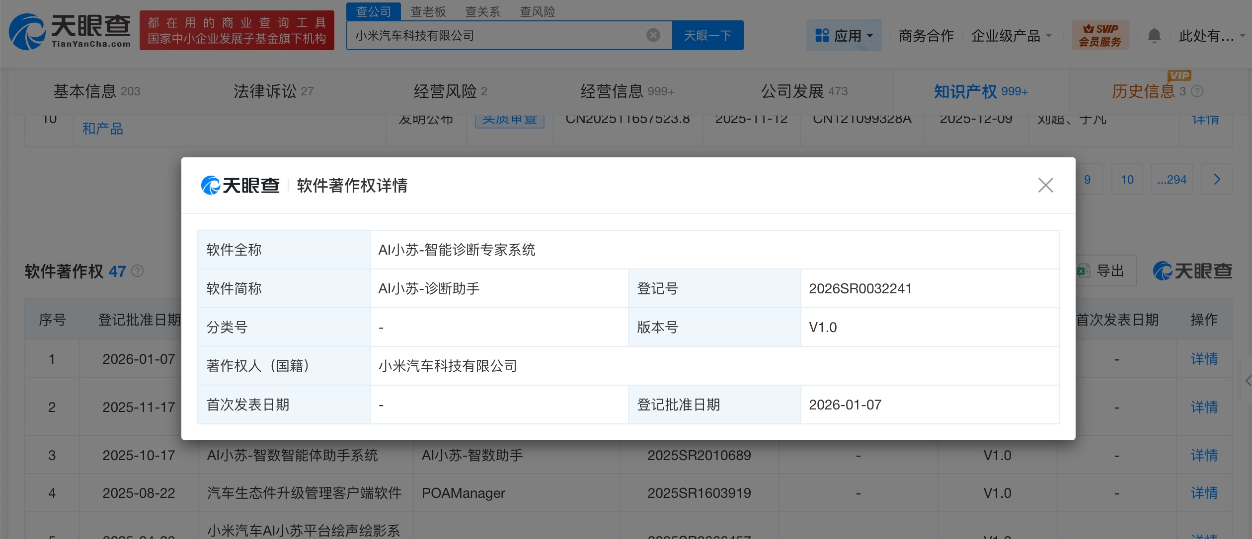 天眼查知识产权信息显示,近日,小米汽车科技有限公司获批登记“ai小苏-智能诊断专家系统”软件著作权,版本号为v1.0。
