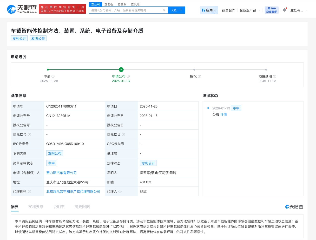 天眼查知识产权信息显示,近日,赛力斯汽车有限公司申请的“车载智能体控制方法、装置、系统、电子设备及存储介质”专利公布。