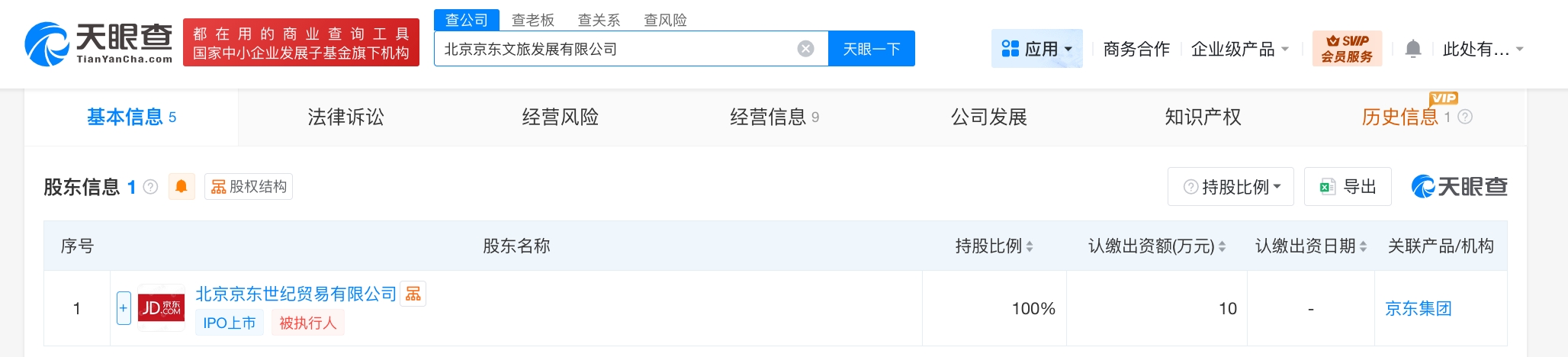 天眼查工商信息显示,近期,北京京东文旅发展有限公司成立,法定代表人为张一泓,注册资本10万人民币,经营范围含旅游业务、歌舞娱乐活动、旅客票务代理、航空商务服务、体验式拓展活动及策划、组织文化艺术交流活动、企业总部管理、票务代理服务、规划设计管理、旅游开发项目策划咨询等。股东信息显示,该公司由北京京东世纪贸易有限公司全资持股。