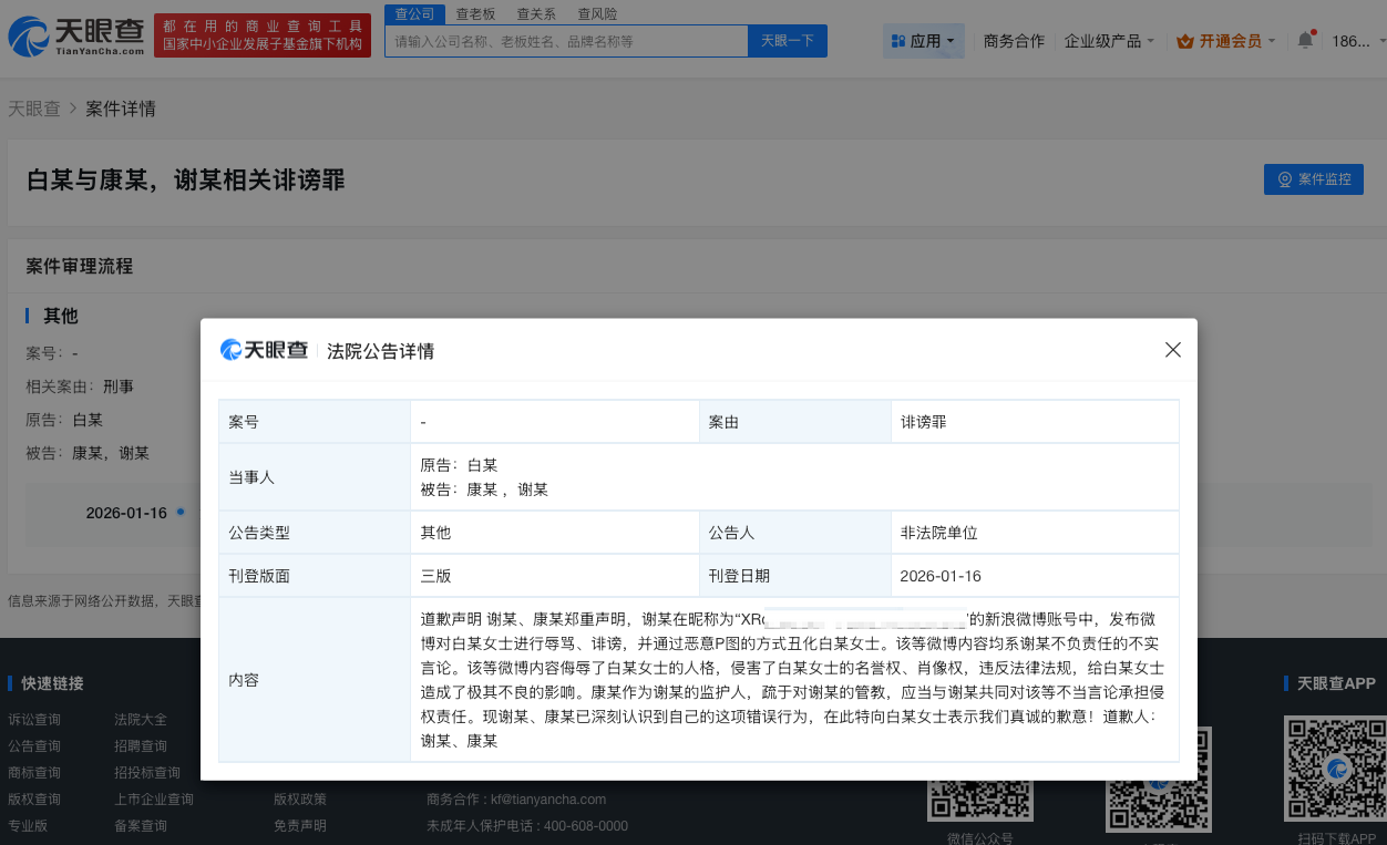 天眼查法律诉讼信息显示,近日,法院公开谢某、康某向白梦妍(白鹿)的致歉声明。内容显示,谢某发布微博对白梦妍女士进行辱骂、诽谤,并通过恶意p图的方式丑化白梦妍女士。该等微博内容均系谢某不负责任的不实言论。该等微博内容侮辱了白梦妍女士的人格,侵害了白梦妍女士的名誉权、肖像权,违反法律法规,给白梦妍女士造成了极其不良的影响。康某作为谢某的监护人,疏于对谢某的管教,应当与谢某共同对该等不当言论承担侵权责任。现谢某、康某已深刻认识到自己的这项错误行为,在此特向白梦妍女士表示歉意。