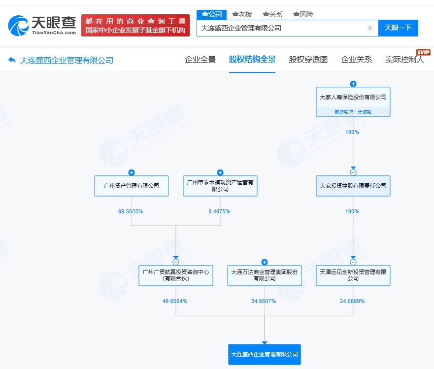 天眼查工商信息显示,近日,大连盛西企业管理有限公司发生工商变更,新增大家人寿保险旗下天津远见创新投资管理有限公司、广州国资旗下广州广资航赢投资咨询中心(有限合伙)为股东,同时,多位主要人员发生变更。