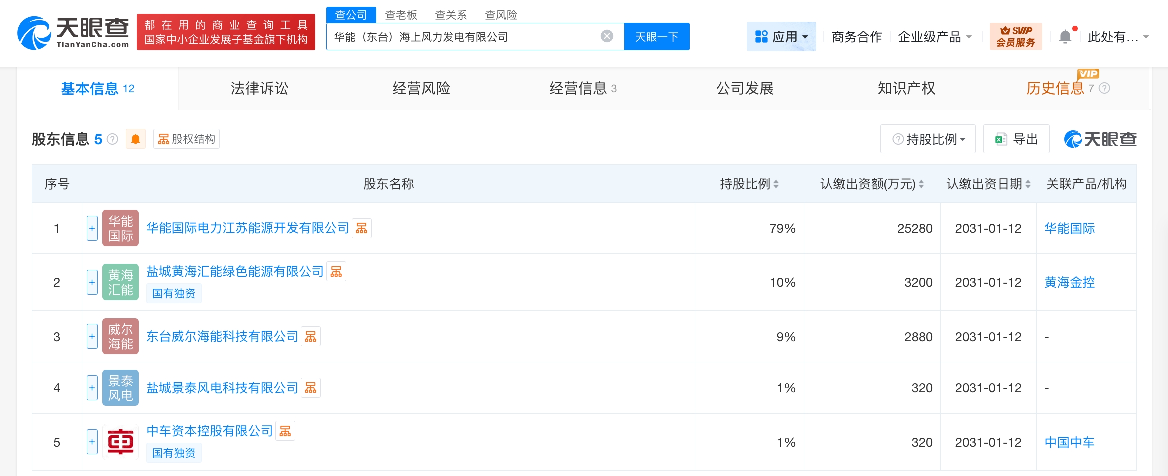 天眼查工商信息显示,近日,华能(东台)海上风力发电有限公司成立,法定代表人为郑枫,注册资本3.2亿人民币,经营范围含发电业务、输电业务、供(配)电业务,建设工程设计,建设工程监理,风力发电技术服务,电气设备修理,工程和技术研究和试验发展,太阳能热利用产品销售,储能技术服务等。股东信息显示,该公司由华能国际电力江苏能源开发有限公司、盐城黄海汇能绿色能源有限公司、中车资本控股有限公司等共同持股。