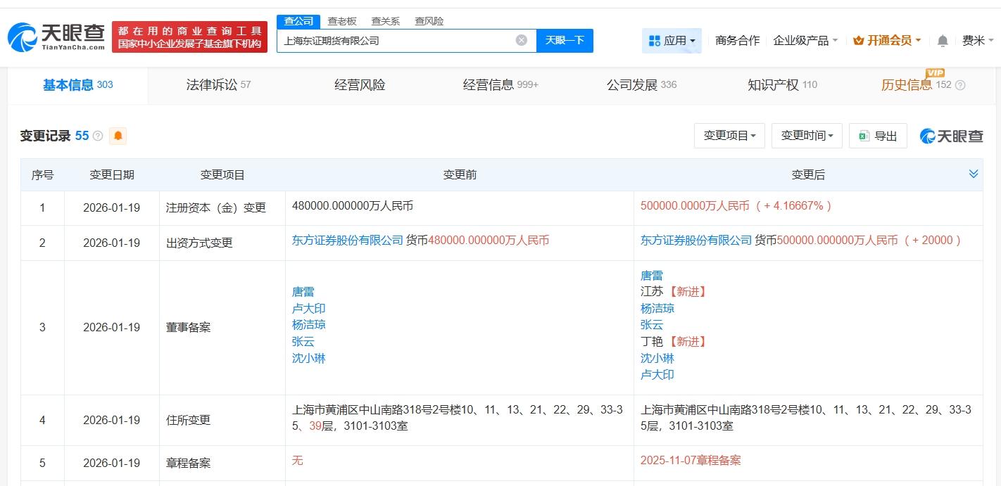 天眼查工商信息显示,近日,上海东证期货有限公司发生工商变更,注册资本由48亿人民币增至50亿人民币,增幅约4%,同时,部分主要人员发生变更。