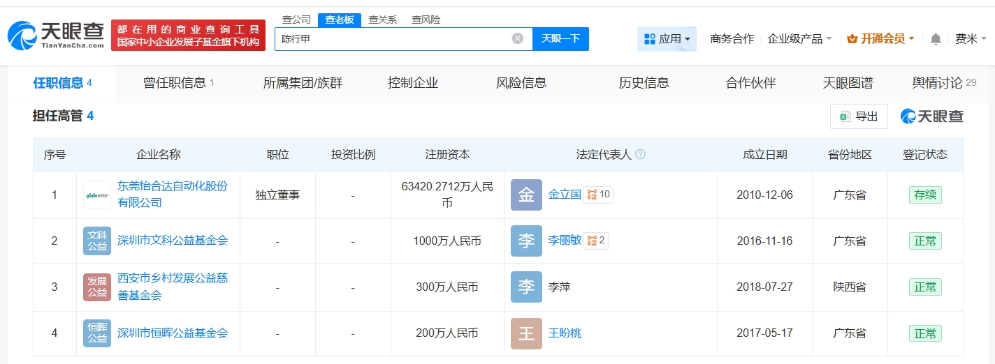 天眼查任职信息显示,陈行甲名下关联4家企业,分别是怡合达(301029)、深圳市文科公益基金会、西安市乡村发展公益慈善基金会、深圳市恒晖公益基金会,陈行甲在上述企业担任独立董事等职位。