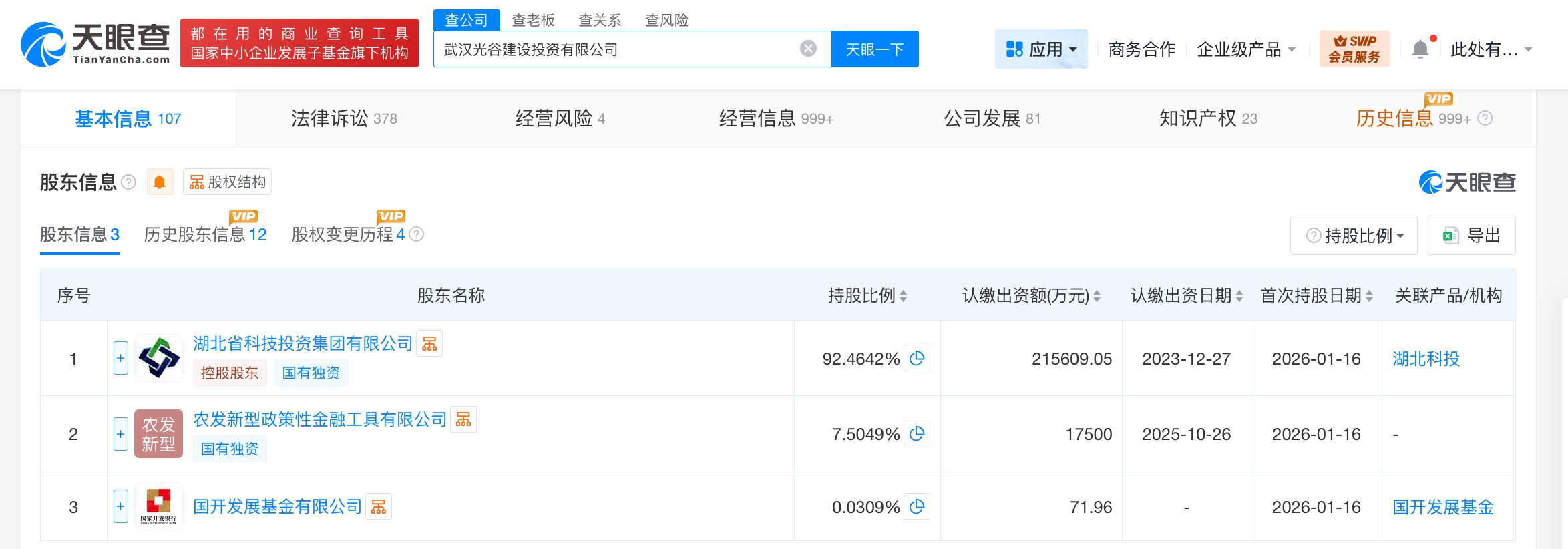 天眼查工商信息显示,近日,武汉光谷建设投资有限公司发生工商变更,新增农发新型政策性金融工具有限公司为股东,注册资本由约21.6亿人民币增至约23.3亿人民币,增幅约8%。