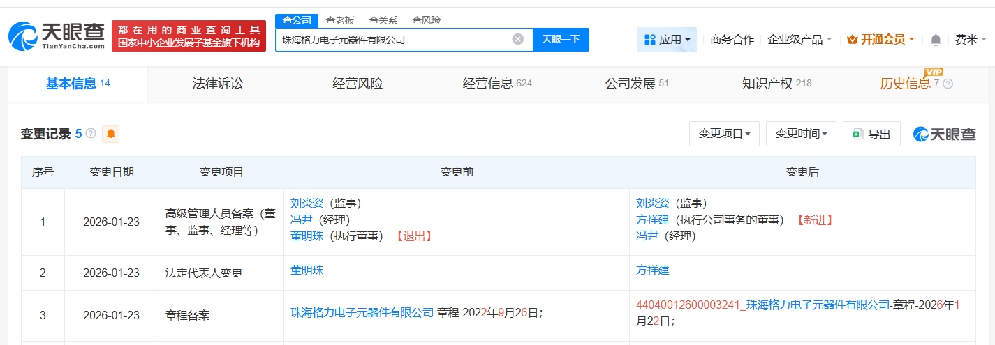 天眼查工商信息显示,近日,珠海格力电子元器件有限公司发生工商变更,董明珠卸任法定代表人、执行董事,方祥建接任法定代表人并担任执行公司事务的董事。