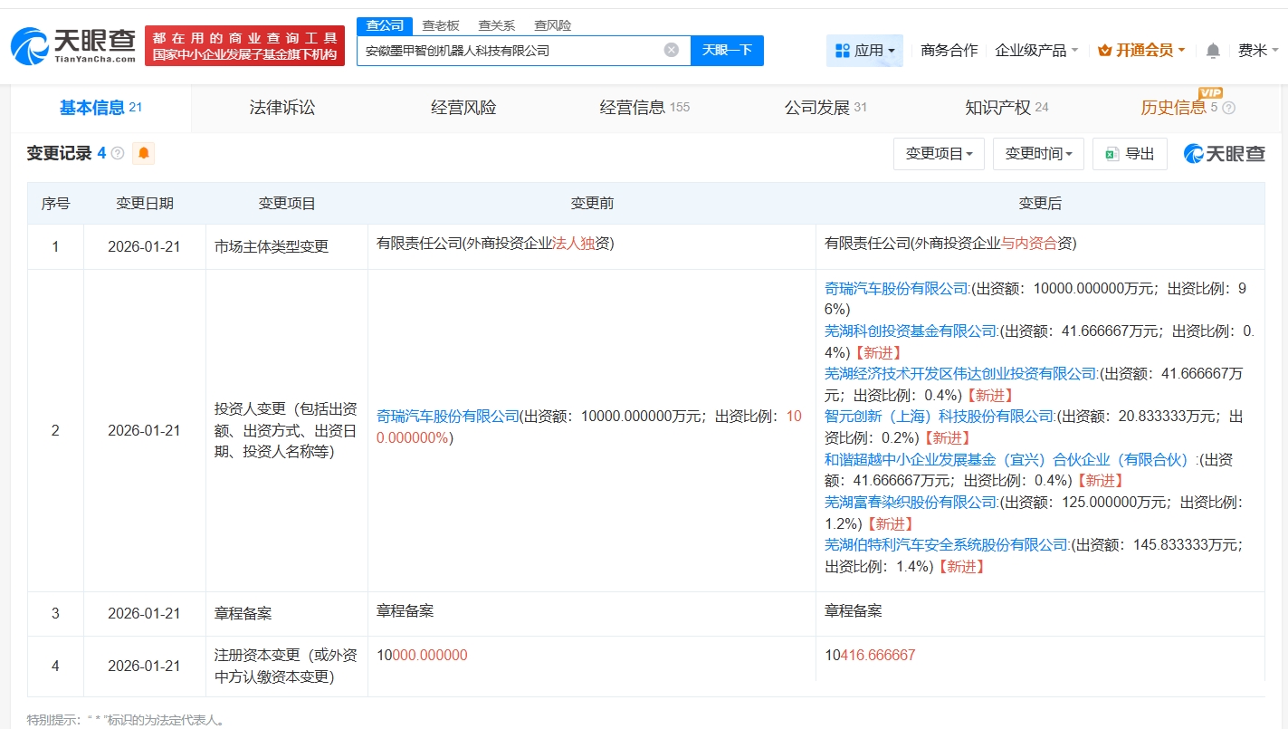 安徽墨甲智创机器人科技有限公司成立于2025年1月,法定代表人为张贵兵,经营范围包括智能机器人销售、智能机器人的研发、工业机器人制造等。股东信息显示,该公司由奇瑞汽车(09973.hk)及上述新增股东共同持股。