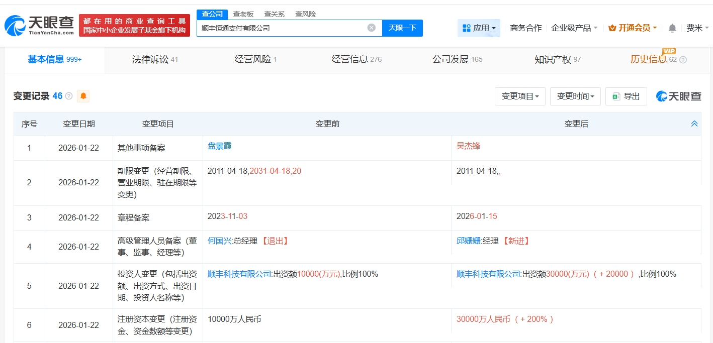 天眼查工商信息显示,近日,顺丰恒通支付有限公司发生工商变更,注册资本由1亿人民币增至3亿人民币,增幅200%,同时,部分主要人员发生变更。