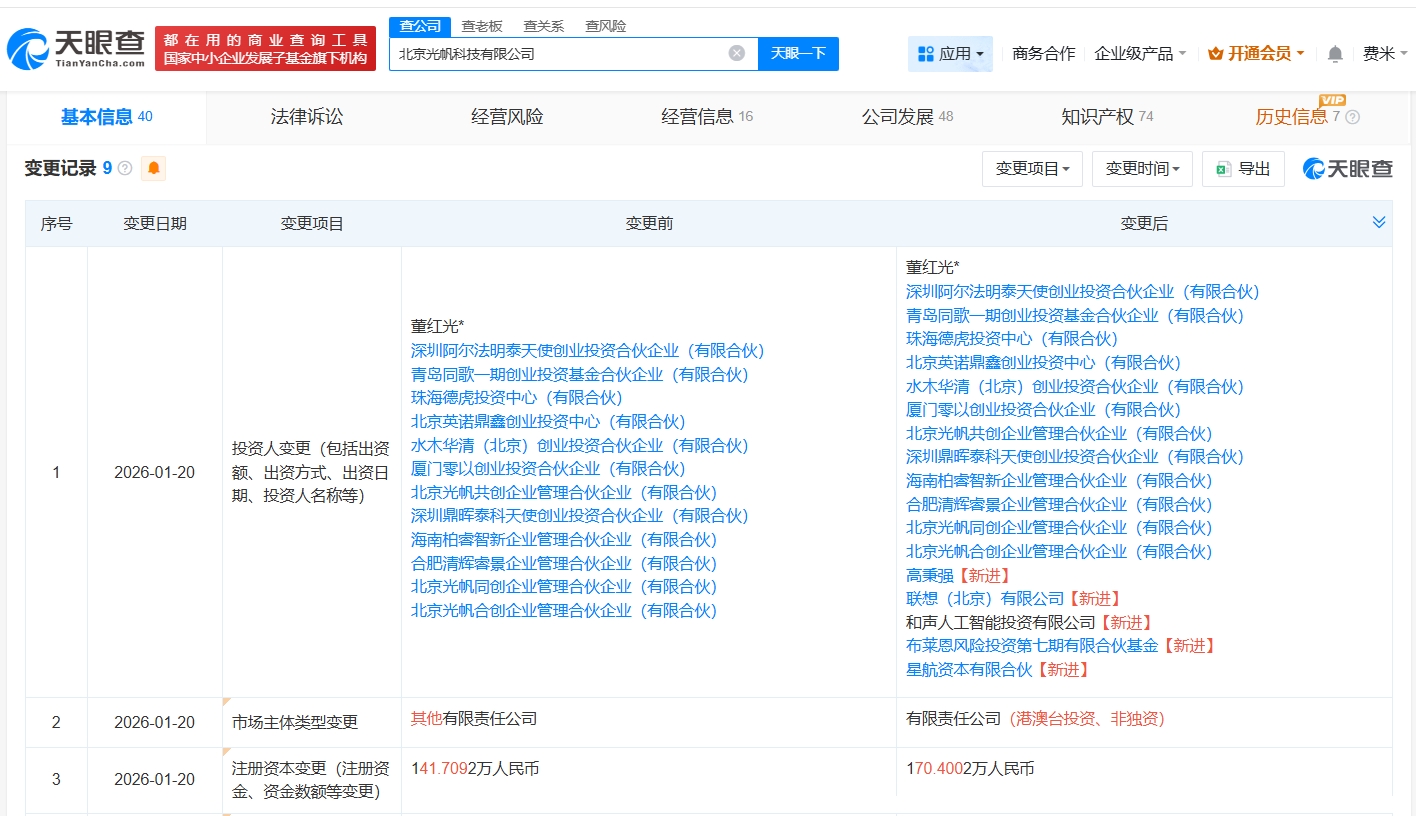 天眼查app显示,近日,北京光帆科技有限公司发生工商变更,新增联想(北京)有限公司、和声人工智能投资有限公司等为股东,同时,注册资本由约141.7万人民币增至约170.4万人民币。
