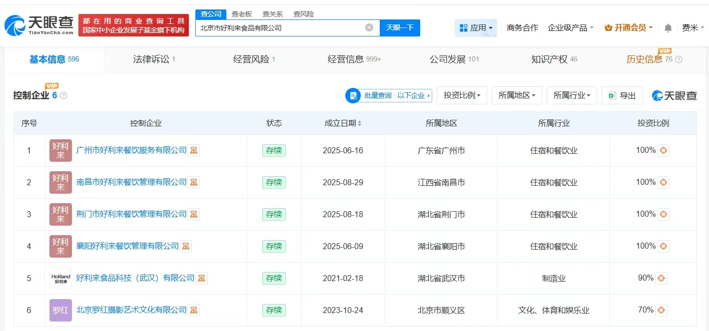 天眼查工商信息显示,好利来关联公司北京市好利来食品有限公司成立于2000年4月,法定代表人为李金铎,注册资本6500万人民币,经营范围包括餐饮服务、食品销售、生鲜乳道路运输等。股东信息显示,该公司由罗红、陈艳共同持股。控制企业信息显示,该公司控制6家企业,包括广州市好利来餐饮服务有限公司、南昌市好利来餐饮管理有限公司等。天眼风险信息显示,该公司曾因产品责任纠纷、买卖合同纠纷等被起诉。