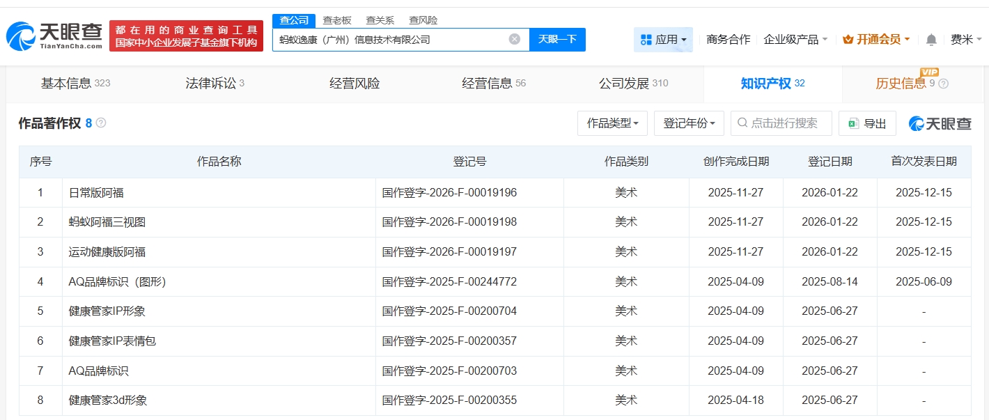 天眼查知识产权信息显示,近日,蚂蚁逸康(广州)信息技术有限公司登记“日常版阿福”“蚂蚁阿福三视图”“运动健康版阿福”作品著作权,作品类别均为美术。
