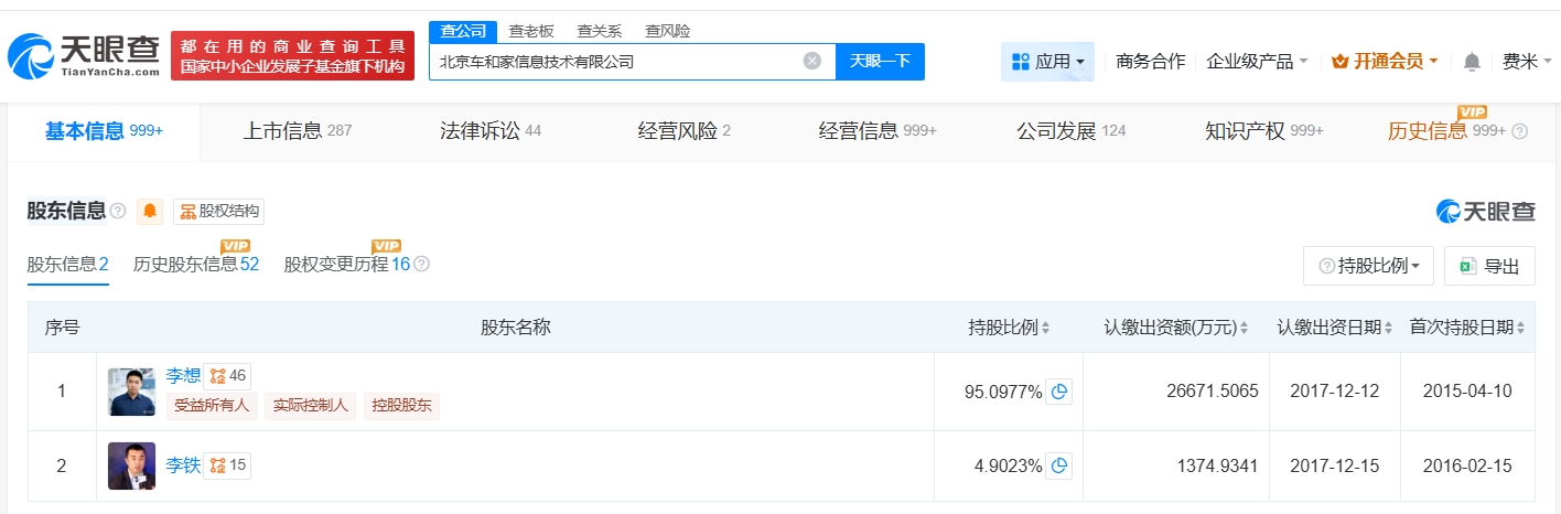 天眼查工商信息显示,理想汽车关联公司北京车和家信息技术有限公司成立于2015年4月,法定代表人为冯伟丽,注册资本约2.8亿人民币,经营范围包括基础软件服务、应用软件服务、经济贸易咨询等。股东信息显示,该公司由李想、李铁共同持股。对外投资信息显示,该公司对外投资11家企业,其中6家企业处于存续状态,其余5家企业已注销。值得一提的是,近期,理想汽车旗下理想智造汽车服务(上海)有限公司、北京励鼎汽车销售有限公司、北京罗克维尔斯科技有限公司均发生减资行为。