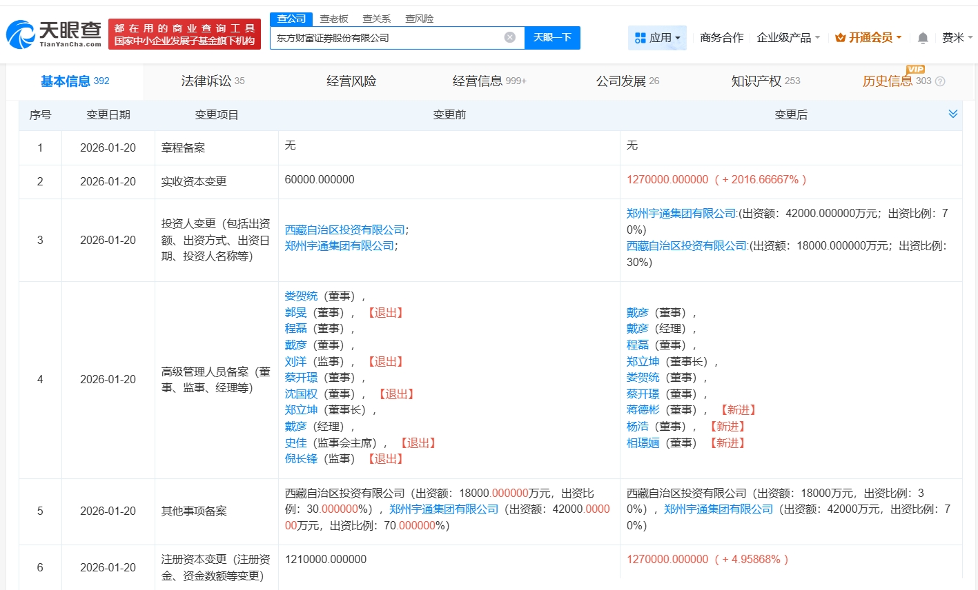 天眼查app显示,近日,东方财富证券股份有限公司发生工商变更,注册资本由121亿人民币增至127亿人民币,增幅约5%,同时,多位高管发生变更。