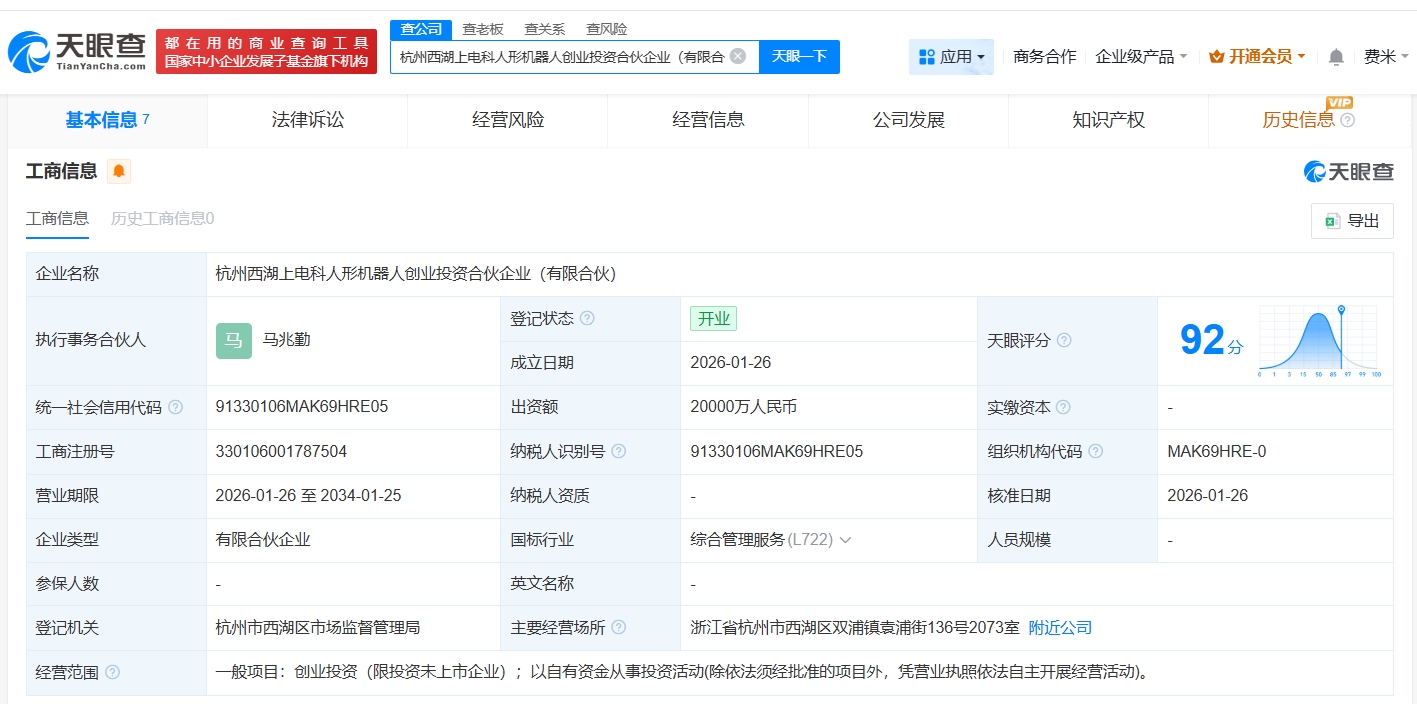 天眼查app显示,近日,杭州西湖上电科人形机器人创业投资合伙企业(有限合伙)成立,执行事务合伙人为马兆勤,出资额2亿人民币,经营范围为创业投资、以自有资金从事投资活动,由上海电器科学研究所(集团)有限公司、上海沿浦(605128)、兴瑞科技(002937)、福赛科技(301529)等共同出资。