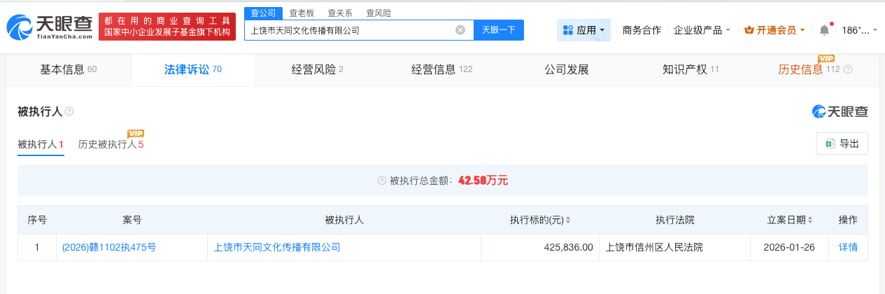 天眼查天眼风险信息显示,近日,上饶市天同文化传播有限公司新增一则被执行人信息,执行标的42.5万余元,执行法院为上饶市信州区人民法院。