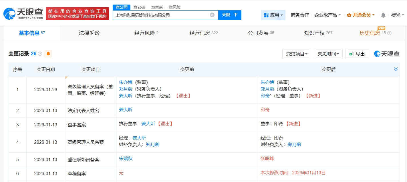 天眼查app显示,近日,上海阶跃星辰智能科技有限公司发生工商变更,姜大昕卸任法定代表人、执行董事、经理,印奇接任法定代表人、经理并担任董事职务。