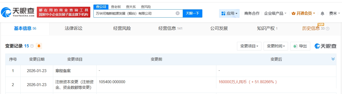 天眼查app显示,近日,万华河海新能源发展(烟台)有限公司发生工商变更,注册资本由10.54亿人民币增至16亿人民币,增幅约52%。