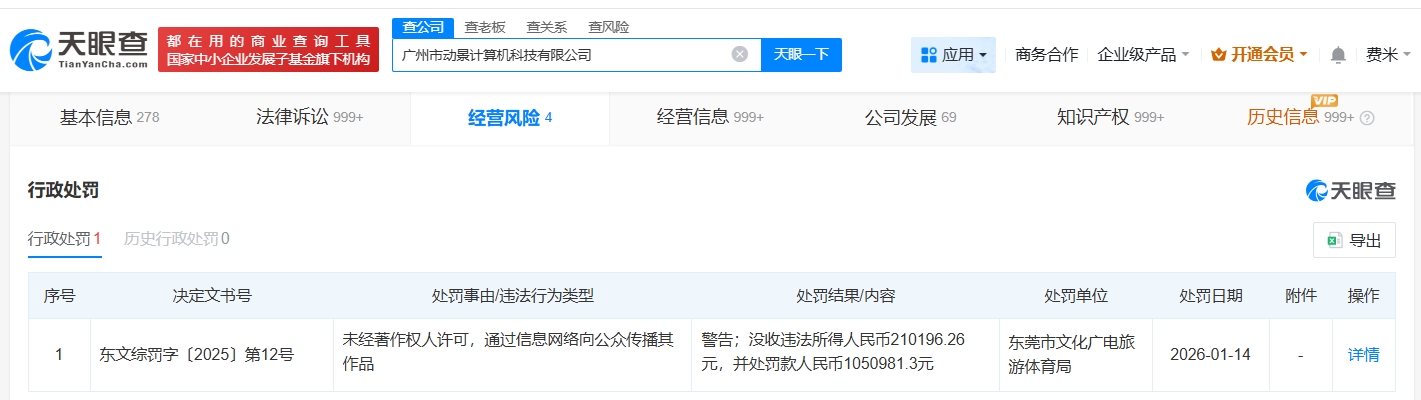 天眼查经营风险信息显示,近日,uc浏览器关联公司广州市动景计算机科技有限公司被东莞市文化广电旅游体育局没收违法所得21万余元,并处罚款105万余元。处罚事由显示,该公司未经著作权人许可,通过信息网络向公众传播其作品。