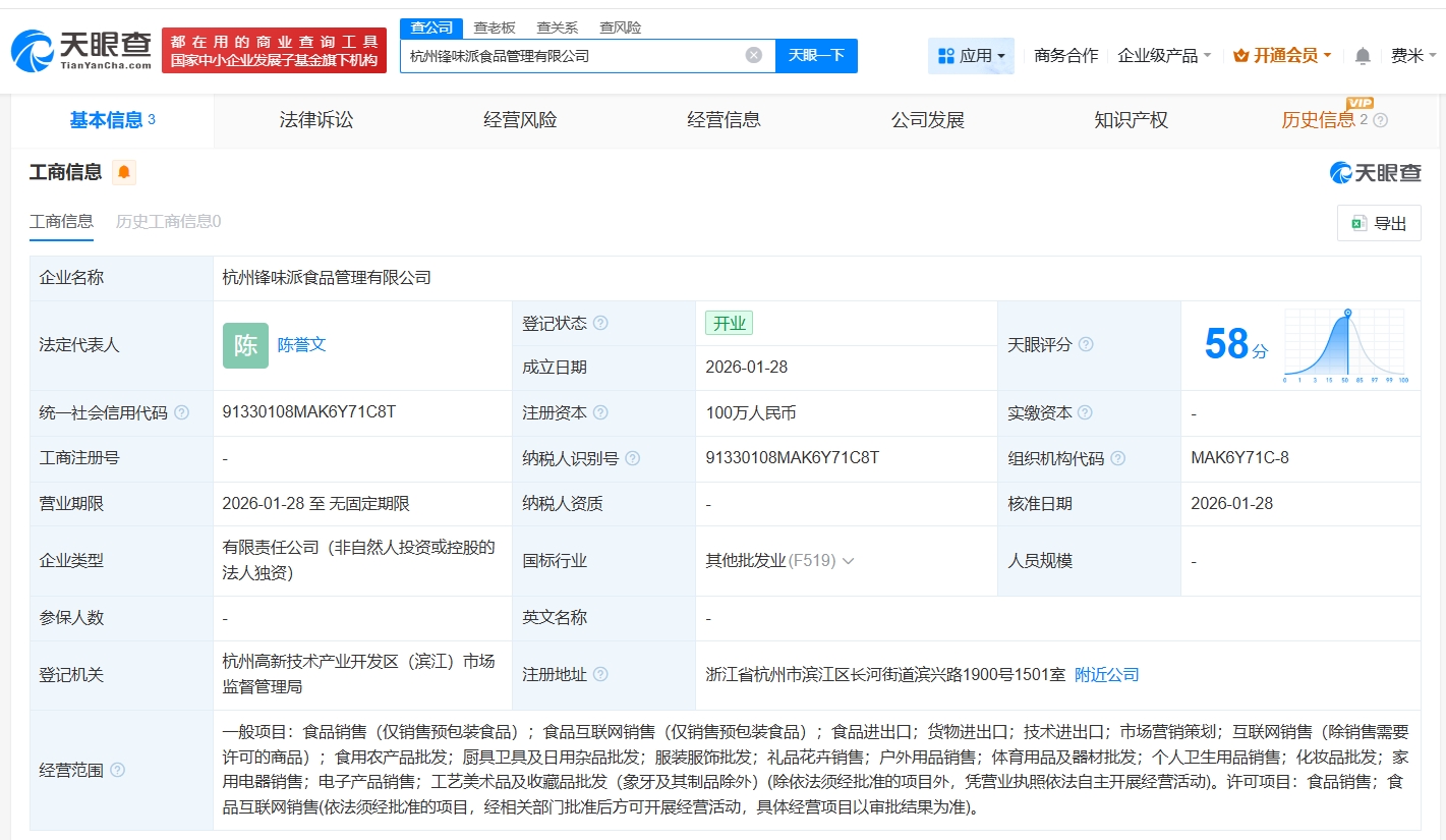 天眼查app显示,近日,杭州锋味派食品管理有限公司成立,法定代表人为陈誉文,注册资本100万人民币,经营范围包括食品互联网销售、食品进出口、货物进出口等,由谢霆锋创立的食品品牌关联公司杭州锋味派食品有限公司全资持股。