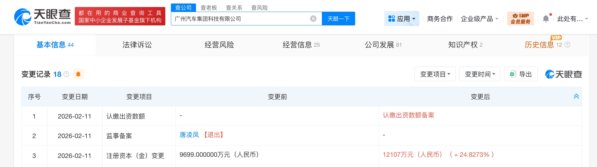 天眼查app显示,近日,广州汽车集团科技有限公司发生工商变更,注册资本由9699万人民币增至约1.2亿人民币,增幅约25%。
