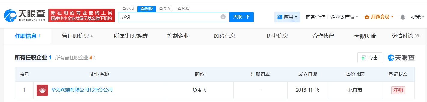 天眼查任职信息显示,赵明目前名下仅关联华为终端有限公司北京分公司,该企业处于注销状态,值得一提的是,其名下曾关联4家存续公司,分别是荣耀终端股份有限公司、深圳市智信新信息技术有限公司、西安荣耀终端有限公司、北京荣耀终端有限公司。