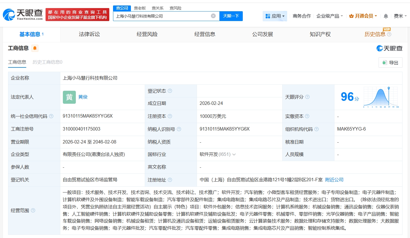 天眼查app显示,2月24日,上海小马慧行科技有限公司成立,法定代表人为黄俊,注册资本1亿美元,经营范围包括软件开发、汽车销售、小微型客车租赁经营服务等,由香港小马智行有限公司全资持股。