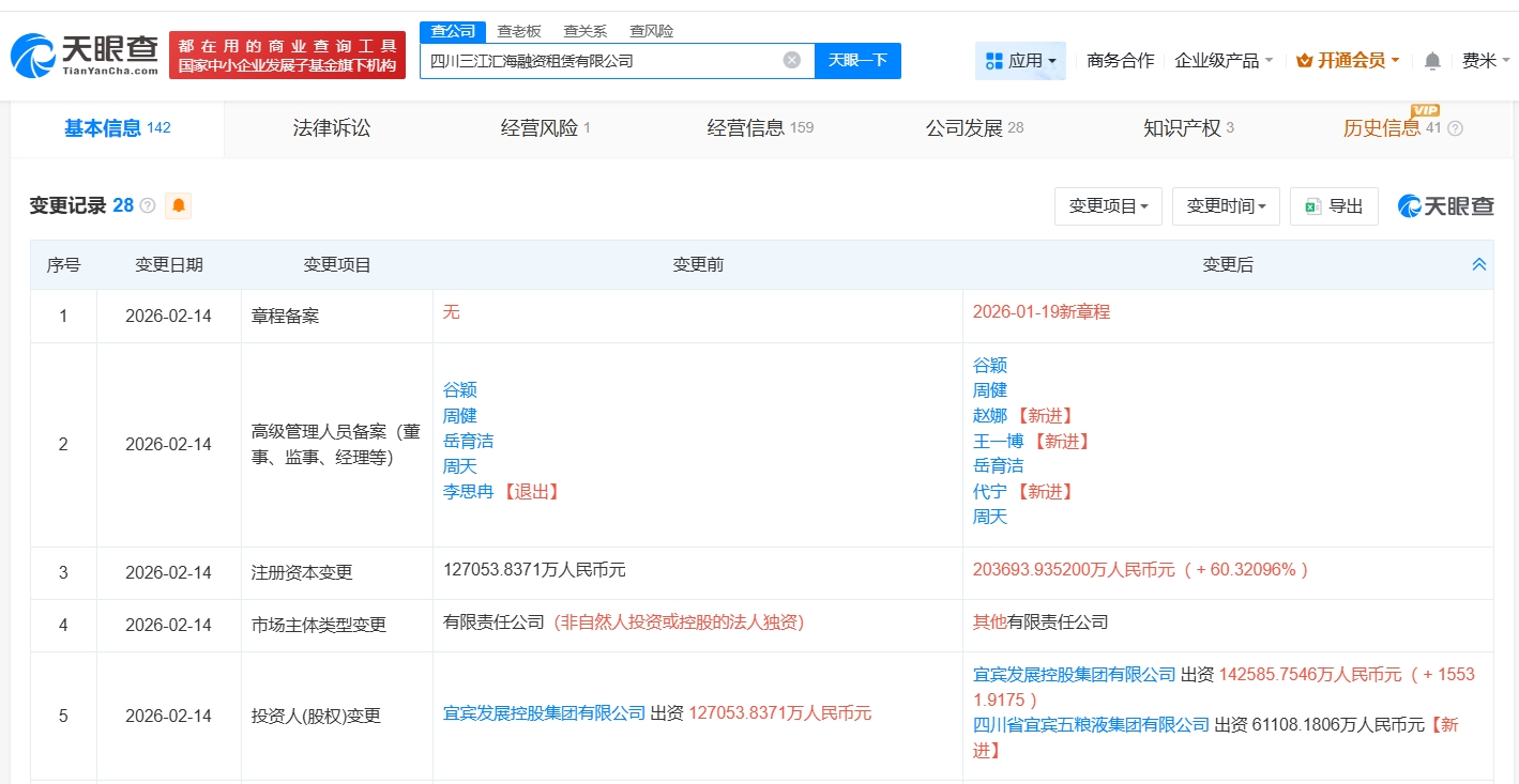 天眼查app显示,近日,四川三江汇海融资租赁有限公司发生工商变更,新增四川省宜宾五粮液集团有限公司为股东,同时,注册资本由约12.7亿人民币增至约20.4亿人民币,增幅约60%。