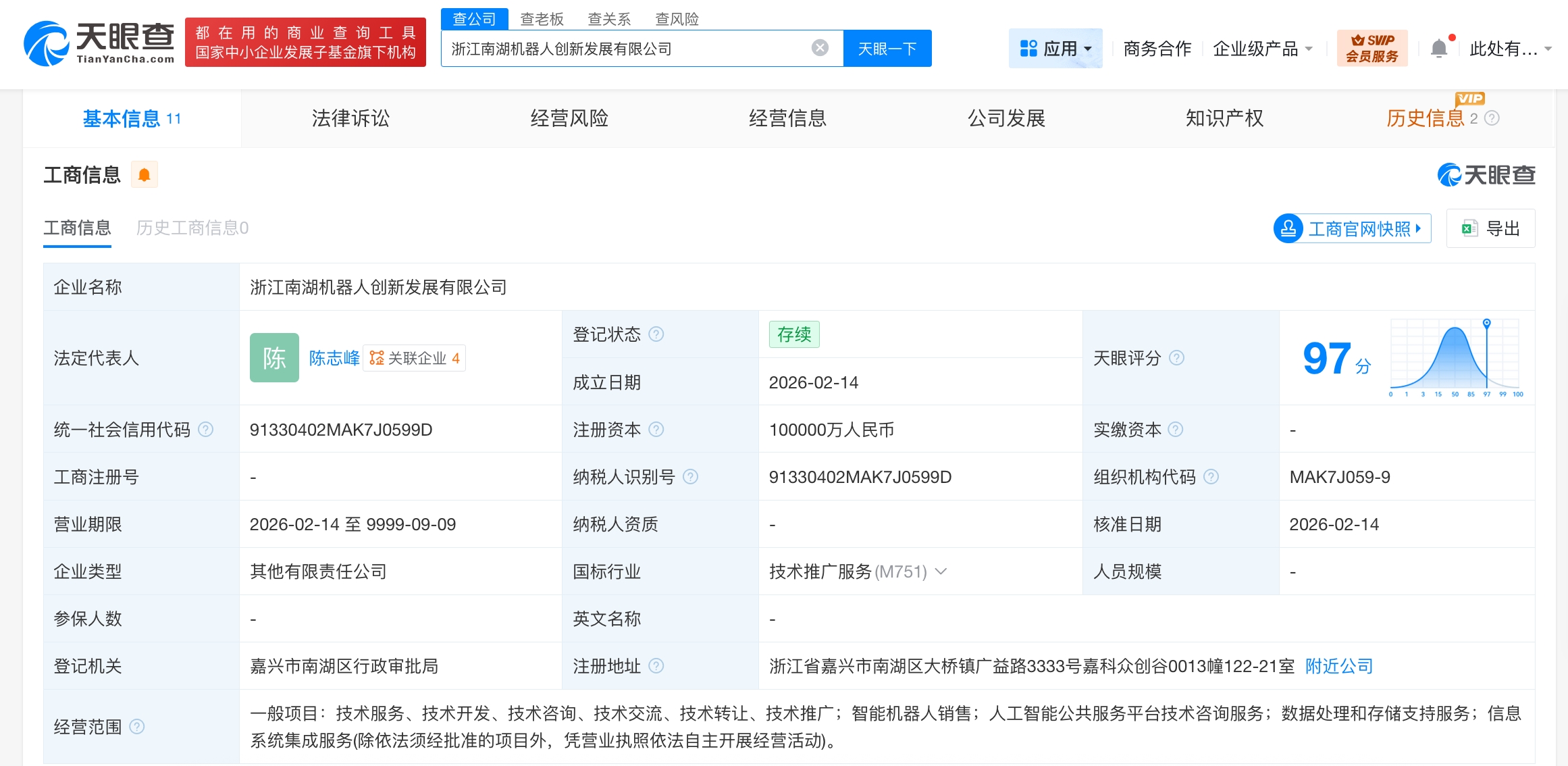 天眼查app显示,近日,浙江南湖机器人创新发展有限公司成立,法定代表人为陈志峰,注册资本10亿人民币,经营范围为技术服务、技术开发、技术咨询、技术交流、技术转让、技术推广,智能机器人销售,人工智能公共服务平台技术咨询服务,数据处理和存储支持服务,信息系统集成服务,由嘉兴科技城产业投资基金有限公司、浙江南湖数据发展集团有限公司、嘉兴市群英投资开发有限公司、嘉兴市双龙建设发展有限公司等共同持股。