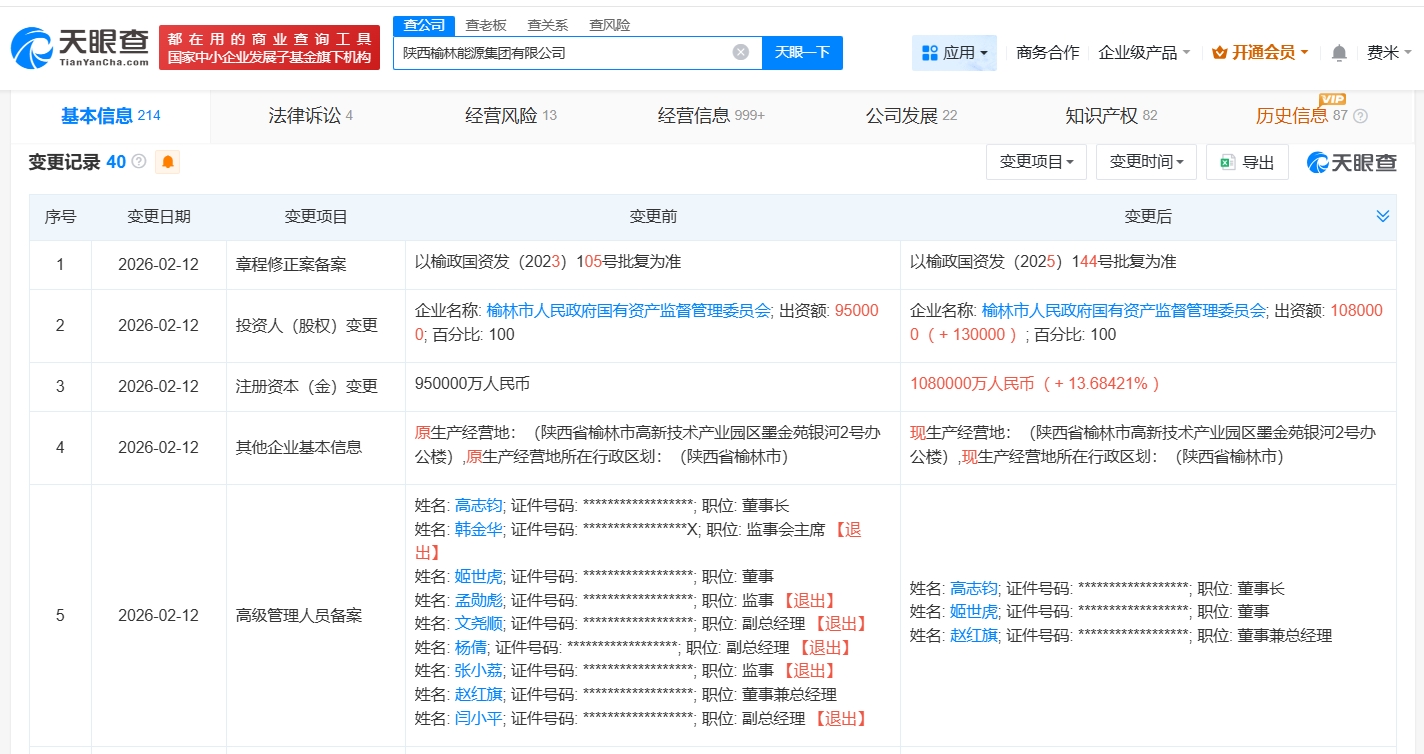 天眼查app显示,近日,陕西榆林能源集团有限公司发生工商变更,注册资本由95亿人民币增至108亿人民币,增幅约14%。