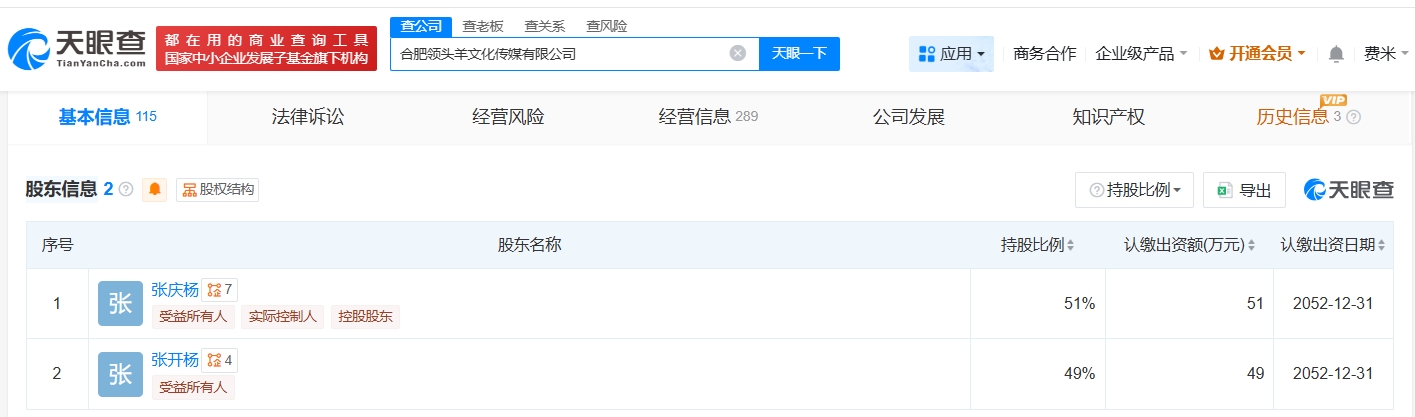 合肥领头羊文化传媒有限公司成立于2022年4月,法定代表人为张庆杨(疯狂小杨哥),注册资本100万人民币,经营范围包括广播电视节目制作经营、演出经纪、广告发布等,由张庆杨、张开杨共同持股。控制企业信息显示,该公司控制40余家企业,其中30多家企业处于存续状态,包括六安市三羊开泰旅游发展有限公司、安徽三只羊供应链服务有限公司等,其余企业均已注销。