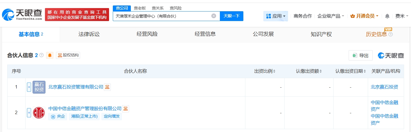 天眼查app显示,近日,天津厚禾企业管理中心(有限合伙)成立,执行事务合伙人为北京赢石投资管理有限公司,出资额约60亿人民币,经营范围为企业管理、企业管理咨询、信息咨询服务,由中信金融资产(02799.hk)及其旗下北京赢石投资管理有限公司共同出资。