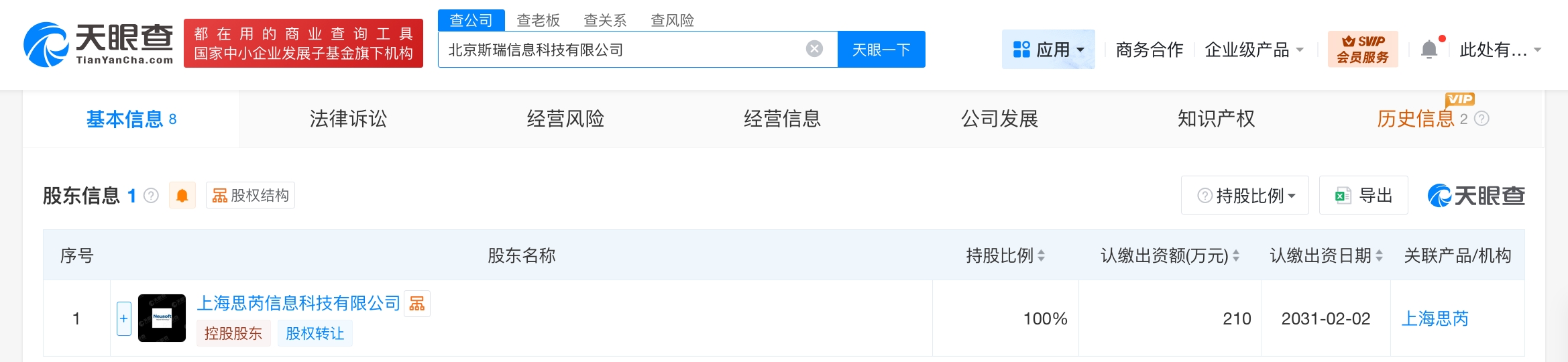 天眼查app显示,近日,北京斯瑞信息科技有限公司成立,法定代表人为孟浩,注册资本210万人民币,经营范围含数字文化创意内容应用服务、信息技术咨询服务、软件外包服务、动漫游戏开发、数据处理和存储支持服务、信息系统集成服务、信息系统运行维护服务、信息咨询服务等,由东软集团旗下上海思芮信息科技有限公司全资持股。