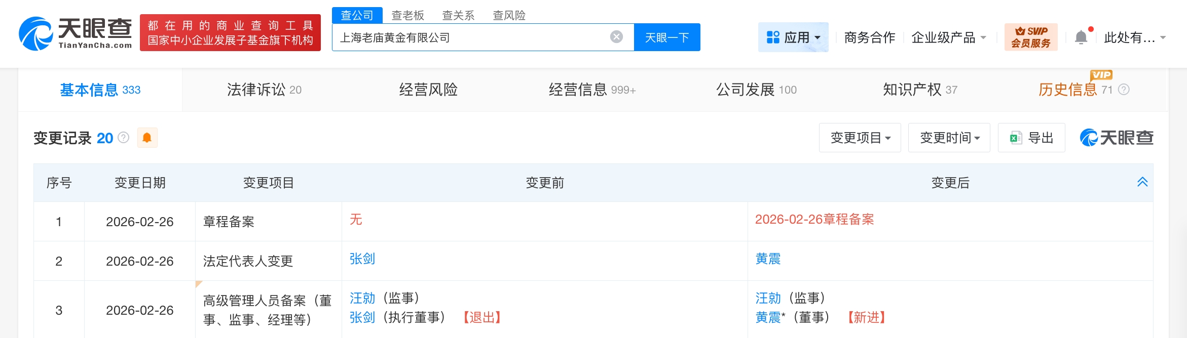 天眼查app显示,近日,上海老庙黄金有限公司发生工商变更,张剑卸任法定代表人、执行董事,由黄震接任法定代表人并担任董事。