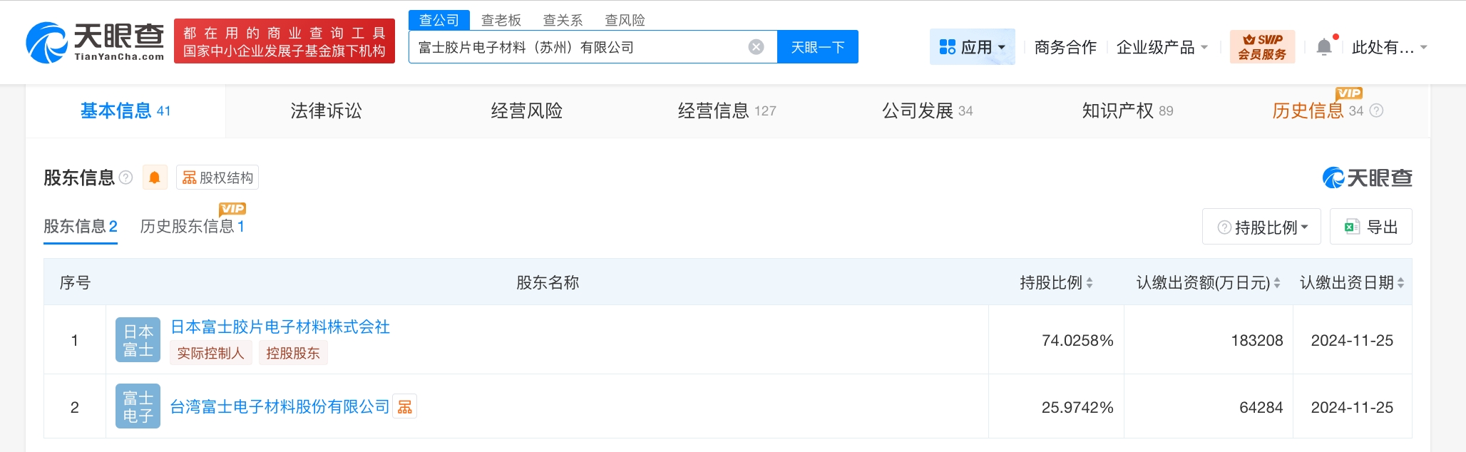 天眼查app显示,近日,富士胶片电子材料(苏州)有限公司发生工商变更,注册资本由7.7亿日元增至约24.7亿日元,增幅约221%。