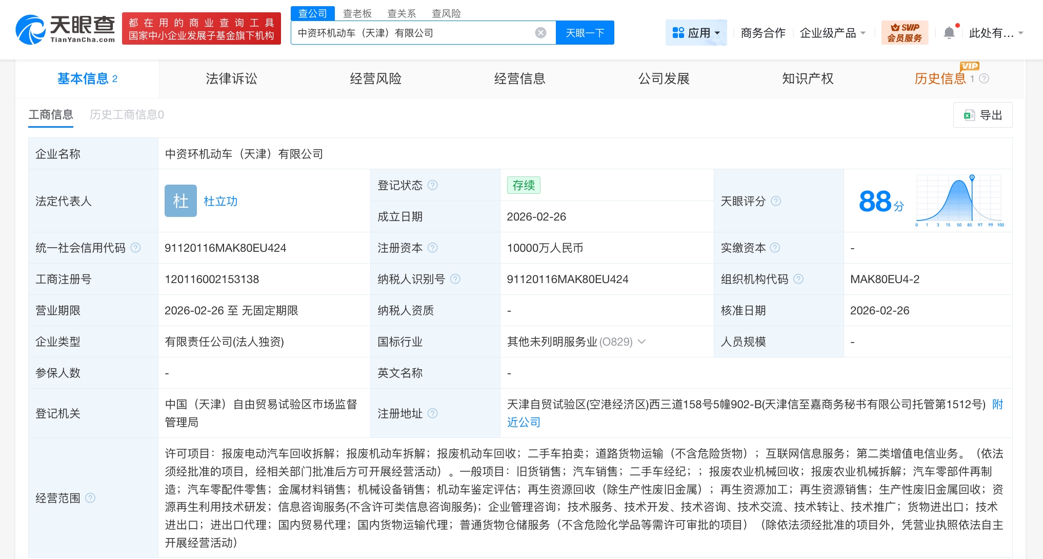 天眼查app显示,近日,中资环机动车(天津)有限公司成立,法定代表人为杜立功,注册资本1亿人民币,经营范围含报废电动汽车回收拆解、报废机动车拆解、二手车拍卖、道路货物运输、汽车销售、二手车经纪、报废农业机械回收、报废农业机械拆解、再生资源加工等,由中国资源循环集团机动车有限公司全资持股。
