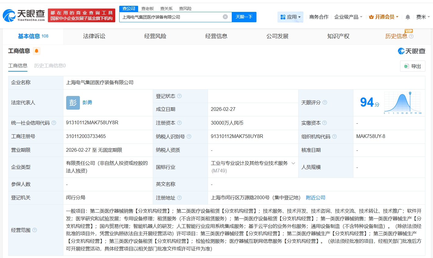 天眼查app显示,2月27日,上海电气集团医疗装备有限公司成立,法定代表人为彭勇,注册资本3亿人民币,经营范围含软件开发、医学研究和试验发展、专用设备修理等,由上海电气控股集团有限公司全资持股。