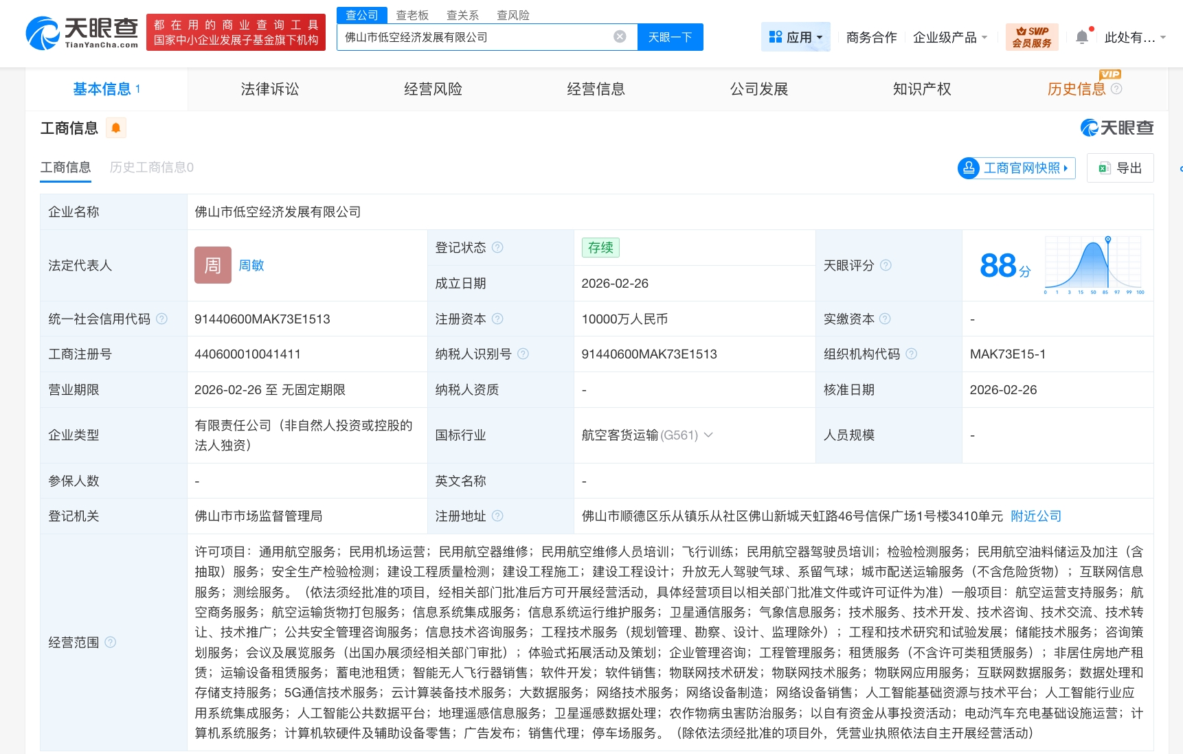 天眼查app显示,近日,佛山市低空经济发展有限公司成立,法定代表人为周敏,注册资本1亿人民币,经营范围含通用航空服务、民用机场运营、民用航空器维修、民用航空维修人员培训、飞行训练、民用航空器驾驶员培训、检验检测服务、民用航空油料储运及加注服务、互联网信息服务等,由佛山市交通投资集团有限公司全资持股。