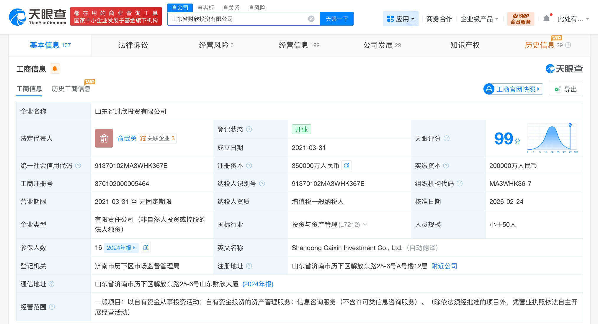 该公司成立于2021年3月,法定代表人为俞武勇,经营范围为以自有资金从事投资活动、自有资金投资的资产管理服务、信息咨询服务。合伙人信息显示,该公司由山东省财欣资产运营有限公司全资持股。