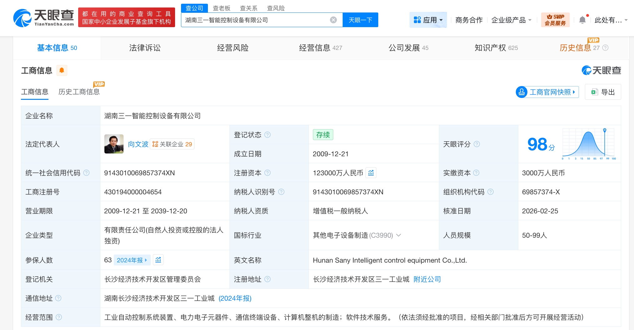 该公司成立于2009年12月,法定代表人为向文波,经营范围为工业自动控制系统装置、电力电子元器件、通信终端设备、计算机整机的制造,软件技术服务,由三一重工(600031)全资持股。