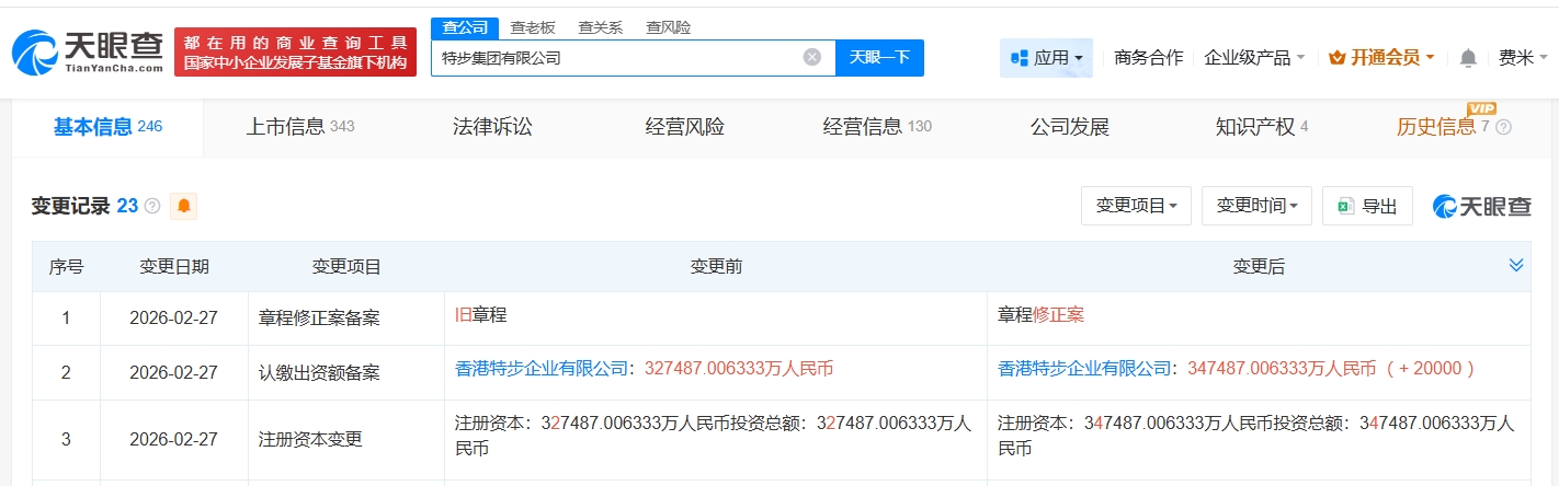 天眼查app显示,近日,特步集团有限公司发生工商变更,注册资本由约32.7亿人民币增至约34.7亿人民币。