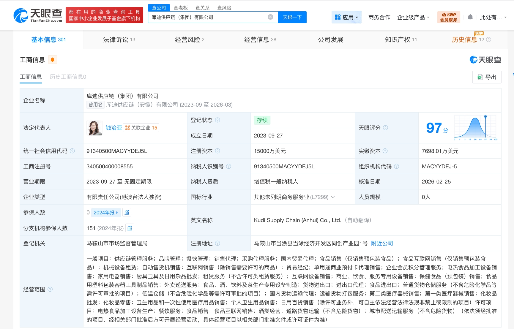 该公司成立于2023年9月,法定代表人为钱治亚,注册资本1.5亿美元,经营范围含供应链管理服务、品牌管理、餐饮管理、采购代理服务、国内贸易代理、食品销售、食品互联网销售、贸易经纪等。股东信息显示,该公司由库迪咖啡(中国)有限公司全资持股。