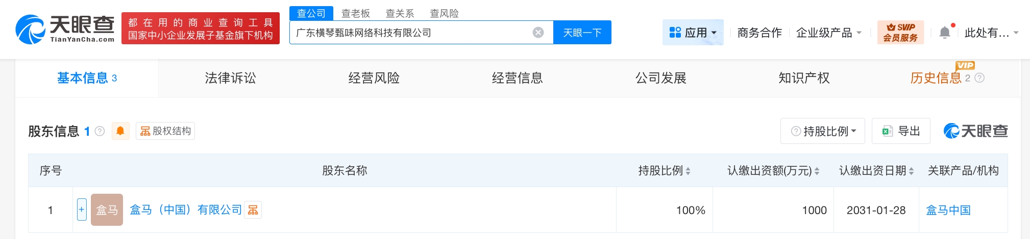 天眼查工商信息显示,近日,广东横琴甄味网络科技有限公司成立,法定代表人为廖榜鹏,注册资本1000万人民币,经营范围含第二类医疗器械销售、房地产经纪、物业管理、粮食收购、单用途商业预付卡代理销售、货物进出口、技术进出口、信息系统集成服务等。股东信息显示,该公司由盒马(中国)有限公司全资持股。