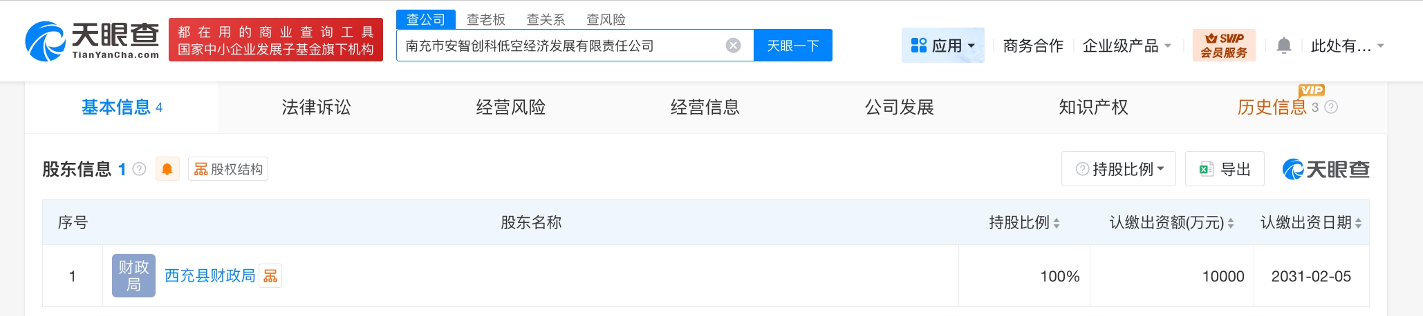 天眼查工商信息显示,近日,南充市安智创科低空经济发展有限责任公司成立,法定代表人为谢欣,注册资本1亿人民币,经营范围含智能无人飞行器制造、智能无人飞行器销售、航空运营支持服务、航空运输设备销售、人工智能行业应用系统集成服务、信息系统集成服务等。股东信息显示,该公司由西充县财政局全资持股。