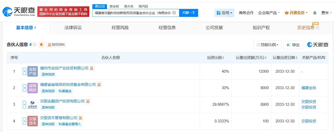 天眼查app显示,近日,福建省交融科技创新股权投资基金合伙企业(有限合伙)成立,执行事务合伙人为交银资本管理有限公司,出资额3亿人民币,经营范围为以私募基金从事股权投资、投资管理、资产管理等活动,由福州市金投产业投资有限公司、福建省省级政府投资基金有限公司、交银金融资产投资有限公司、交银资本管理有限公司共同出资。