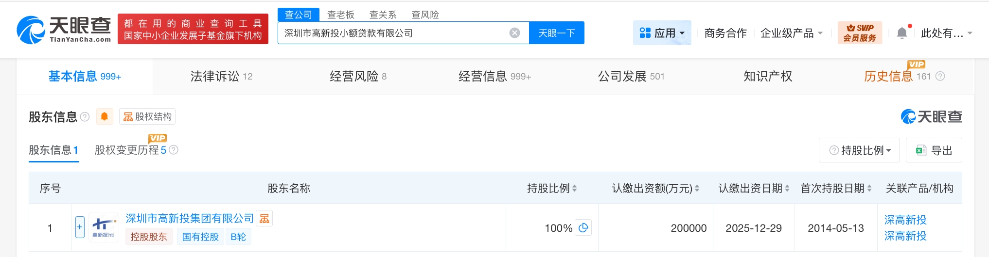 该公司成立于2014年5月,法定代表人为曾珲,经营范围为专营小额贷款业务。股东信息显示,该公司由深圳市高新投集团有限公司全资持股。