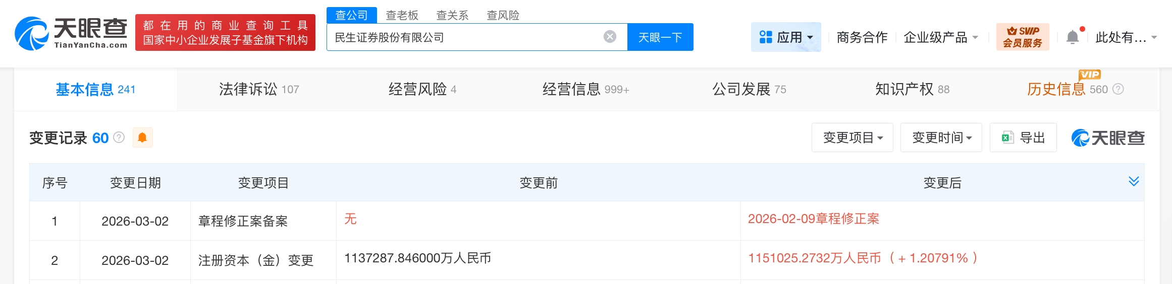 天眼查工商信息显示,近日,民生证券股份有限公司发生工商变更,注册资本由约113.7亿人民币增至约115.1亿人民币。