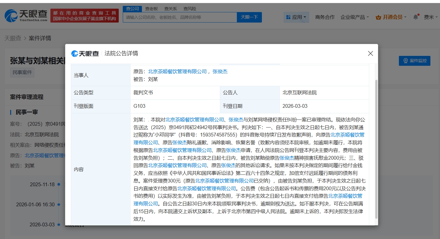天眼查天眼风险信息显示,近日,北京互联网法院向被告刘某公告送达民事判决书,涉及原告北京茶姬餐饮管理有限公司、创始人张俊杰与其网络侵权责任纠纷案件。法院判决被告刘某向北京茶姬餐饮管理有限公司、张俊杰赔礼道歉,赔偿张俊杰精神损害抚慰金2000元。